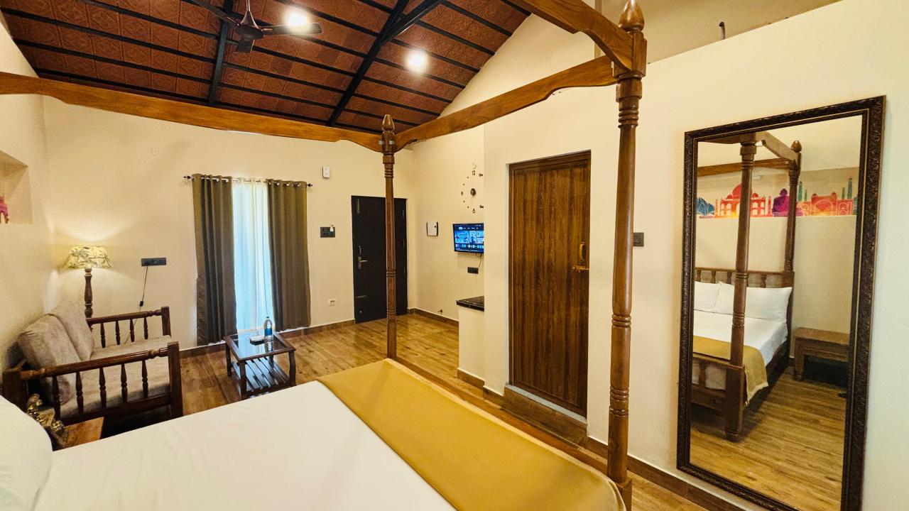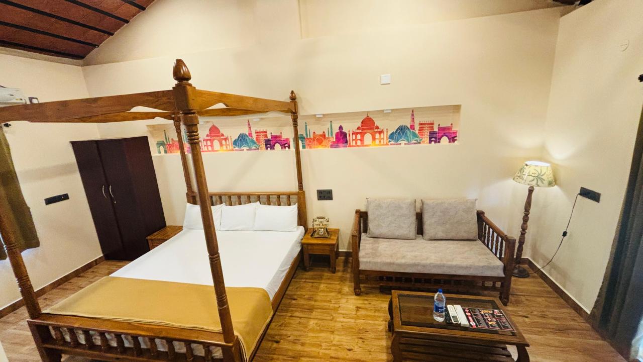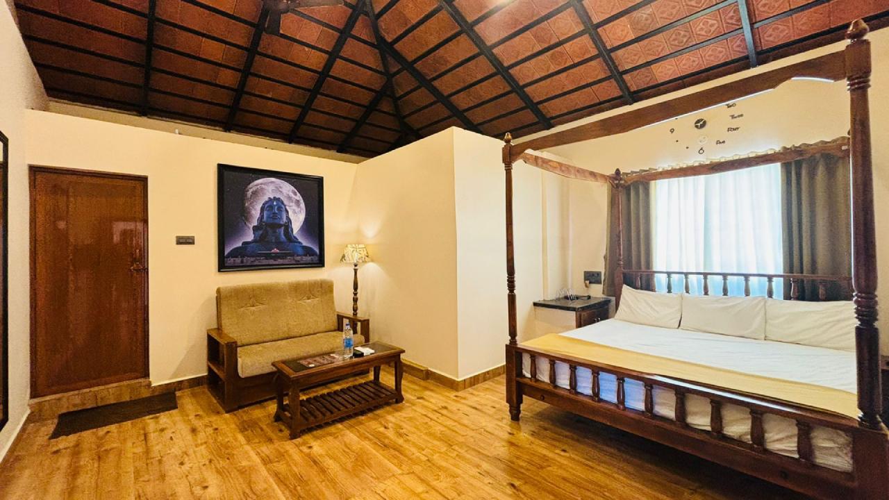 Our elegantly appointed Eco Castle rooms offer a serene and culturally rich retreat, perfect for relaxation and rejuvenation. The spacious interior features a stunning four poster bed, complimented by a vibrant monument cityscape artwork, and a beautiful depiction of Adiyogi. The room’s warm ambience is enhanced by wooden floors and clay tile ceiling. Our “Eco Castle rooms” are designed to provide peaceful and culturally enriching experience.