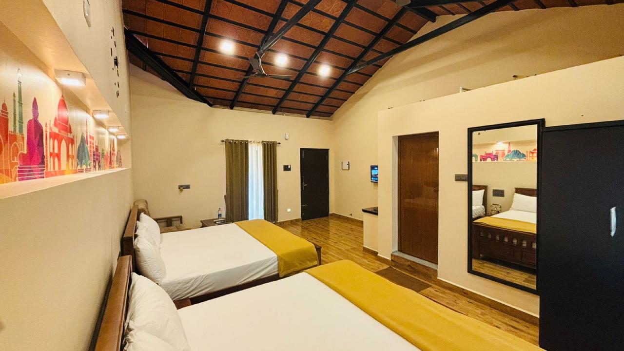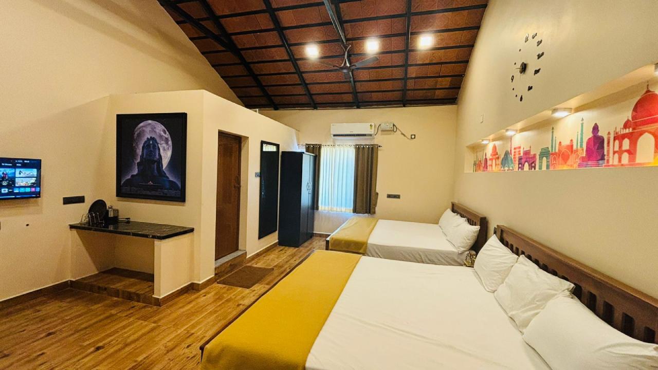 Our Family Suite room is designed to provide a comfortable and relaxing stay, with modern amenities and comfortable furnishings. The room’s decor is inspired by Indian culture, with a large picture of Adiyogi and a colourful mural depicting various Indian Landmarks. The room features two double beds making it preferable for families with children and groups of friends. Whether you are travelling with family or friends, our “Family Suite Room” will be the best choice to provide the comfort and relaxation you deserve.
